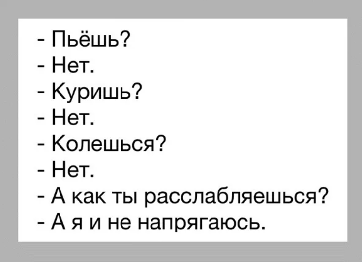 - Как вы расслабляетесь? - Да я и не напрягаюсь... Классный анекдот...Особенно эта его ключевая фраза... Но смело сказать о себе: "А я и не напрягаюсь", не сможет, пожалуй, никто...И это вообще-то нормально. Кстати, о "нормально". Нормально, когда к психологу приходит человек или пара и один из них, а еще хлеще, если оба спрашивают: "а это нормально, что...далее следует что-то вполне нормальное, на мой взгляд, и настойчиво просят объяснить другому, что это ненормально...Такой вот каламбур. Ответ-то у меня все же имеется: все, что законно и устраивает обоих в отношениях, само по себе нормально...Но все же у меня иногда возникает ощущение, что как-то скучно мы живем, что где-то бушуют настоящие страсти и происходит что-то такое, не изведанное даже видавшим виды человеком, женщиной и психологом. Это как еще в одном анекдоте: Вот так, с шутками, анекдотами и каламбурами мы подошли вполне подготовленными к серьезной теме. Одному моему клиенту, с которым мы уже довольно продолжительное время
