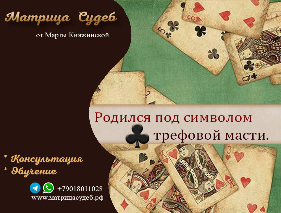 Трефы ♣ Трефовая масть управляет периодом жизни после детства, когда нас каждый день отправляют в школу. Это второе время года и представляет собой летнее время жизни. В матрице судеб масть треф представляет разум и умственную деятельность. Трефы любят читать и узнавать что-то новое, они любят беседы и общение во всех формах. Для человека Треф какое-то образование является необходимым условием, чтобы он мог выполнять свою обязанность по пониманию и переводу фактов жизни. Они также люди, ориентированные на детали, и заметят и найдут то, что другие карточные костюмы не замечают. Человек Треф здесь ищет совершенную правду. Трефы творческие и познают жизнь через разговоры и обучение. Как вечные студенты колледжа колоды, Трефы любопытны, всегда думают и любят говорить, читать и учить. Известные личности масти Треф. Александр Константинов Екатерина Васильева Людмила Хитяева Человек с негативной Трефой должен избегать соблазна злоупотреблять своей властью посредством манипулирования фактами