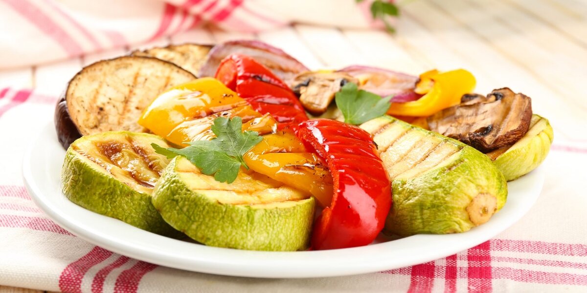 Ингредиенты Приготовление Нарежьте баклажаны и кабачок толстыми кружочками, а перец — крупными кусочками. В миску выложите мелко нарезанный чеснок, чёрный перец, базилик и хмели-сунели и половину соевого соуса. Добавьте к приправам овощи. Полейте оставшимся соусом и маслом и тщательно перемешайте. Маринуйте овощи 15–20 минут. Выложите их на решётку и готовьте, периодически переворачивая, около 10 минут до румяности.