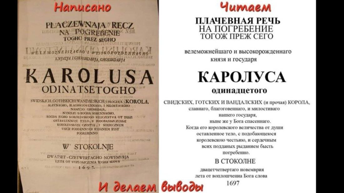 В 2001 году в Москве на исторической выставке "Орёл и лев" были показаны многие исторические документы. Среди них особый интерес представлял текст погребальной речи на смерть шведского короля Карла 11. Этот документ написан латинскими буквами, но словами русского языка. Не задаться вопросом, откуда русская речь в Швеции, было невозможно. Представителями официальной истории была выдвинута версия, что автор речи Юхан Габриэль Спарвенфельдт написал речь таким образом, "чтобы сделать её понятной для русских подданных шведского короля". Данная гипотеза не выглядит убедительной. Эта речь зачиталась на похоронах Карла 11 в 1697 году и была прочитана только на русском языке. А как же носители шведского языка, им речь слушать не нужно было? Или в тот момент этот язык и был официальным языком шведских земель, тем более, что название шведской столицы звучит по-славянски - Стокольня? И это ещё не всё, последняя фотография это снимок со всемирной французской выставки, где павильон шведской ко