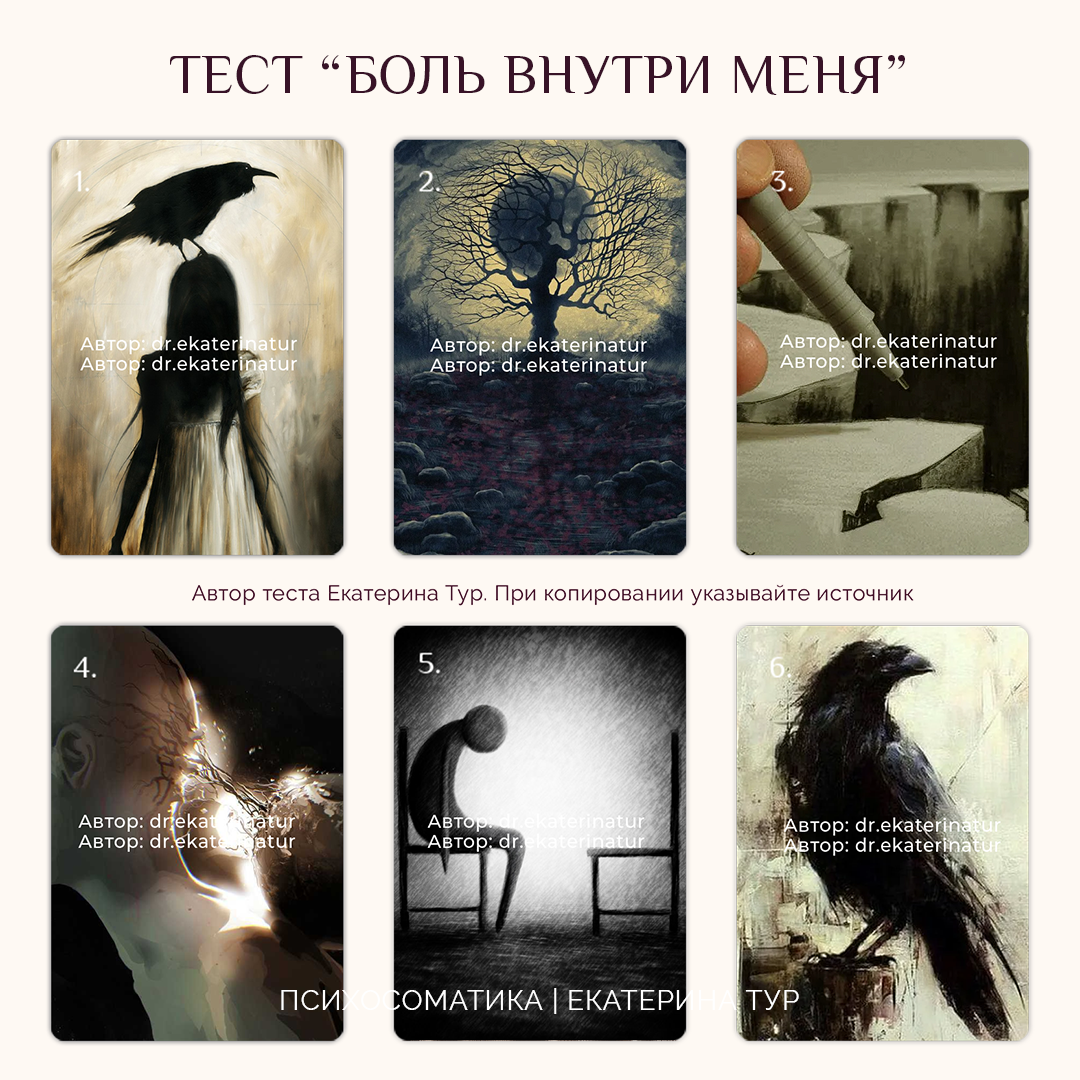 Нейровизуальные тесты - это авторская разработка врача, психосоматолога Екатерины Тур. При помощи вашего подсознания вы можете получить ответы о том, что беспокоит вас сегодня. Выбирайте одну карту, которая вызывает у вас неприятные ощущения, отторжение, неприязнь: Ответы на тест Поделитесь результатом! Что думаете про расшифровку? Официальное сообщество Вконтакте Телеграм канал "Психосоматика с Екатериной Тур"