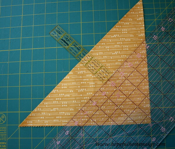 Для такого блока нужно взять квадрат размером 25,4 см и разрезать его по диагонали. Получившиеся треугольники накладываем друг на друга и отменяем 6,4 см от диагонали, как показано маленькой линейкой: Разрезаем по этой линии и параллельно по линии ниже тоже на расстоянии 6,4 см и получаем два меньших треугольника и две трапеции. Берём верхнюю длинную полосу и отменяем вдоль края 6,4 см: Разрезаем ткань, создав два ромба. Повторяем еще раз, отмерив еще 6,4 см от разреза, который только что сделали, и вырезаем еще два ромба. Из одного большого квадрата у вас должно получиться два треугольника, четыре ромба и две трапеции. Повторяем этот процесс с оставшимися тканями: Теперь делаем то же самое со всеми квадратами фона, которые также по длине равны 25,4 см: После того, как все фигуры вырезаны, можно собрать блок. Каждый блок состоит из двух треугоьников. В одном используется фоновая ткань для ромбов и принты для треугольника и трапеции, а в другом треугольнике используется фоновая ткань