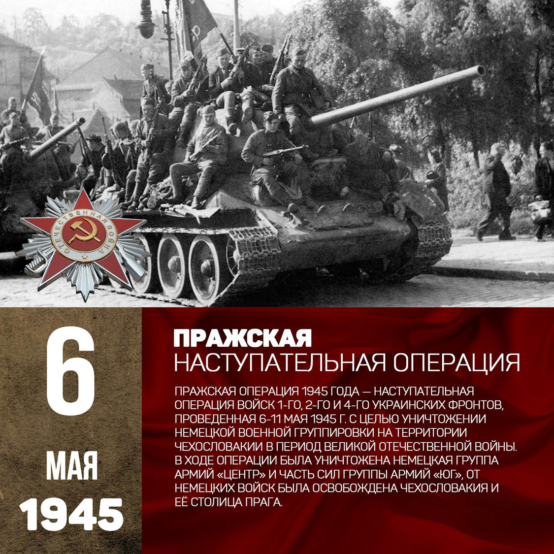 6 мая 1945 года началась Пражская стратегическая наступательная операция — последняя стратегическая операция Красной армии в Великой Отечественной войне, в ходе которой была уничтожена немецкая группы армий «Центр» и «Австрия», от немецких войск была освобождена Чехословакия и её столица Прага.