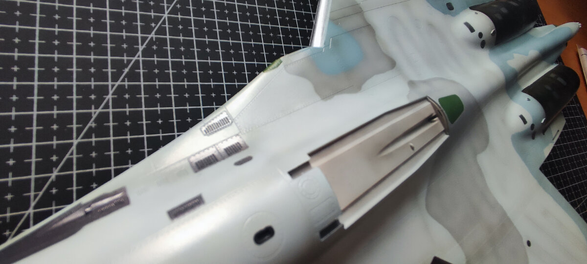 Глава пятая - "Покраска" Продолжаю сборку знаменитого самолета-истребителя Су-27 ранний от компании Hobby boss. На данном этапе буду проводить покраску модели. Статья будет не очень большой и загруженной, по сравнению с работой которая заняла у меня не мало времени. Первым делом защитил малярным скотчем уже окрашенные части. Далее опираясь на инструкцию с декалей фирмы бегемот обозначил для себя где будет наноситься цвет белый и зеленый радиопрозрачные, а где металлики. Грунтовать не стал, просто тщательно обезжирил. Там где будет использоваться металлики выкрасил черным и сразу же выкрасил зеленые элементы. Нанес металлики, использовал цвет сталь и алюминий с капелькой вороненой стали. Задул необходимые лючки белым радиопрозрачным. Кстати в этот раз использовал краски от Армы, заказывал специально тематический набор для Су-27. По качеству особо много сказать не могу, мало были в работе, но то что они ложатся лучше чем ZIP это однозначно. Тут наверное стоит добавить про маски которы