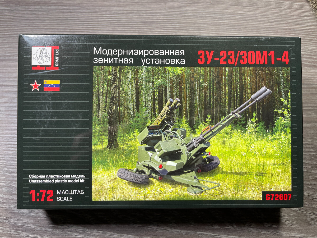 Всем привет. Вторая версия зенитной установки от данной компании, на не модернизированную версию - вот ссылка на статью. Краткая справка ЗУ-23 (Зенитная установка калибра 23 мм, индекс ГРАУ 2А13) — советская 23-мм спаренная зенитная установка, в составе двух авиационных пушек, станка, прицела ЗАП-23, платформы с ходом, наземного прицела Т-3. ЗУ-23 принята на вооружение ВС СССР 22 марта 1960 года. Скорострельность — 2 000 выстрелов в минуту. Масса установки — 950 кг. Масса снаряда — 190 грамм. Дальность стрельбы: 1,5 км по высоте, 2,5 км по дальности. Расчёт — пять человек. ЗУ-23М1 — ЗУ-23-2 c размещённым на ней комплектом «Стрелец», который обеспечивает применение двух отечественных ПЗРК типа «Игла». О наборе Набор вышел в 20хх годах, обычная ЗУ-23 (ссылка на обзор), это была новая разработка. В 2017 году с изменением деталей вышел данный набор. Больше изменений с момента выхода не было (Компания Грань - Российская). Общая информация Производитель - Gran' (Грань) Артикул - G72607 (