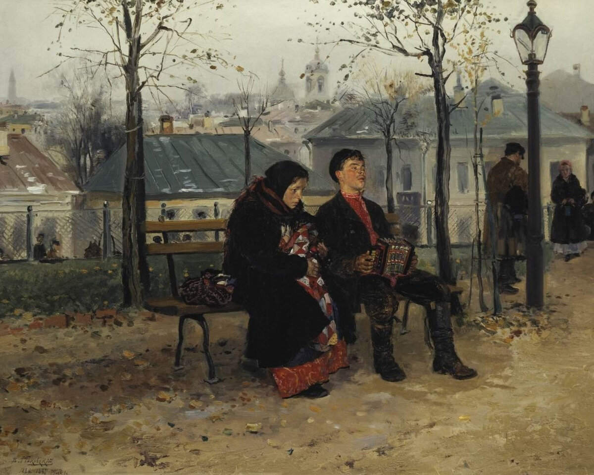 Просто пара присела отдохнуть на скамейку💁♀️Не совсем так. Перед нами развернулась настоящая семейная драма. После отмены крепостного права в 1861 году, (а картина написана в 1886-1887 гг), многим деревенским жителям пришлось отправиться на заработки в город, поменять привычный уклад. Для многих семей это закончилось трагично. Здесь мы видим женщину с ребёнком, которая приехала из деревни повидать мужа. Они сидят рядом, но отдалены друг от друга. В глазах женщины отчаяние, безысходность, она не понимает поведение мужа, не узнает его, а мужчина безразличен. Осенний пейзаж только усиливает тоску и ощущение безысходности. По красной рубашке и юбке героев нашей картины мы можем сделать вывод, что это воскресенье или праздничный день. Мужчина явно тяготится присутствием жены. Он нетрезв (красные щеки, вальяжная поза), ему не нравится так проводить выходной, он хочет в кабак. Они стали чужими друг другу. Интересно, что одна из жительниц села Даратники узнала на этой картине своих родителе