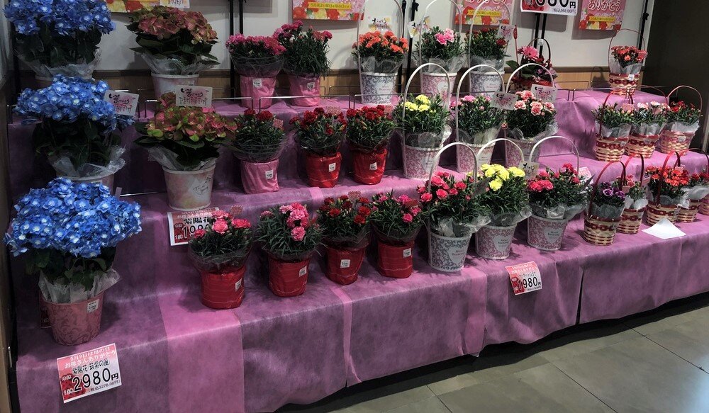 В Японии в преддверии Дня матери во многих супермаркетах начинают продавать гвоздики, в основном в горшках, а вместе с ними - тематические подарки для мам. Тут же можно отправить свой подарок по адресу, оформив доставку в любой город Японии. Праздник отмечается во второе воскресенье мая (в 2023 году, он приходится на 14).