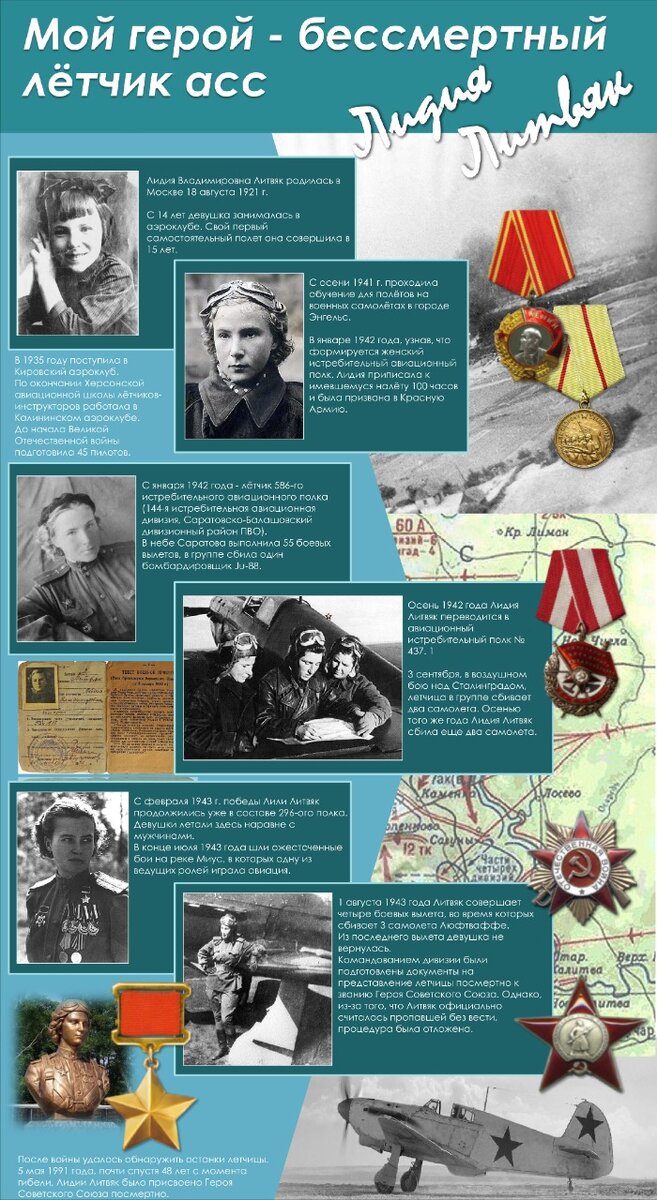 На сайте Бессмертный полк указано, что Лилия (Лидия) Литвяк родилась в Москве 18 августа 1921 г. С 14 лет девушка занималась в аэроклубе. Свой первый самостоятельный полет она совершила в 15 лет. После окончания Херсонской авиационной школы лётчиков-инструкторов работала в Калининском аэроклубе, обучала молодых лётчиков. А потом началась война...