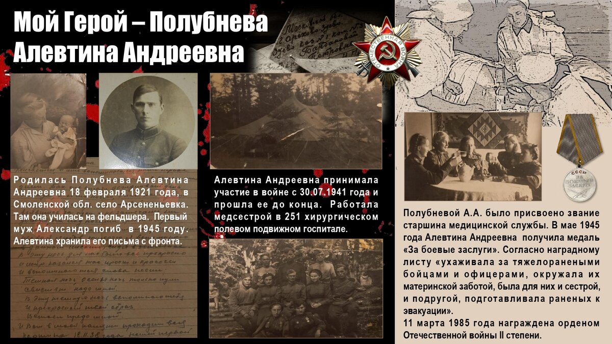 У каждого человека свой герой. Это может быть персонаж из фильма или книги, или из какой-нибудь игры, но не все помнят о своих настоящих героях. Это наши предки, которые защищали не только нас и наше будущее, а нашу Родину. Именно они обеспечили нам прекрасное и спокойное будущее. Именно они дали нам возможность жить. Здесь, в нашей прекрасной стране. Именно поэтому важно передавать и развивать связь поколений, чтобы все знали, кому они обязаны своим безмятежным будущим. Только благодаря их подвигам и их самоотверженности мы с вами можем дышать и радоваться жизни. Поэтому я хочу рассказать вам про человека, которого я считаю своим героем. Это моя прабабушка – Полубнева Алевтина Андреевна. Родилась Полубнева Алевтина Андреевна 18 февраля 1921 года, в Смоленской обл. село Арсененьевка. Там она училась на фельдшера. В 1939 году переехала работать лаборантом в город Белый, где познакомилась с первым мужем Александром Морковкиным и родила от него дочь, Веру, которая умерла спустя 29 дней ж