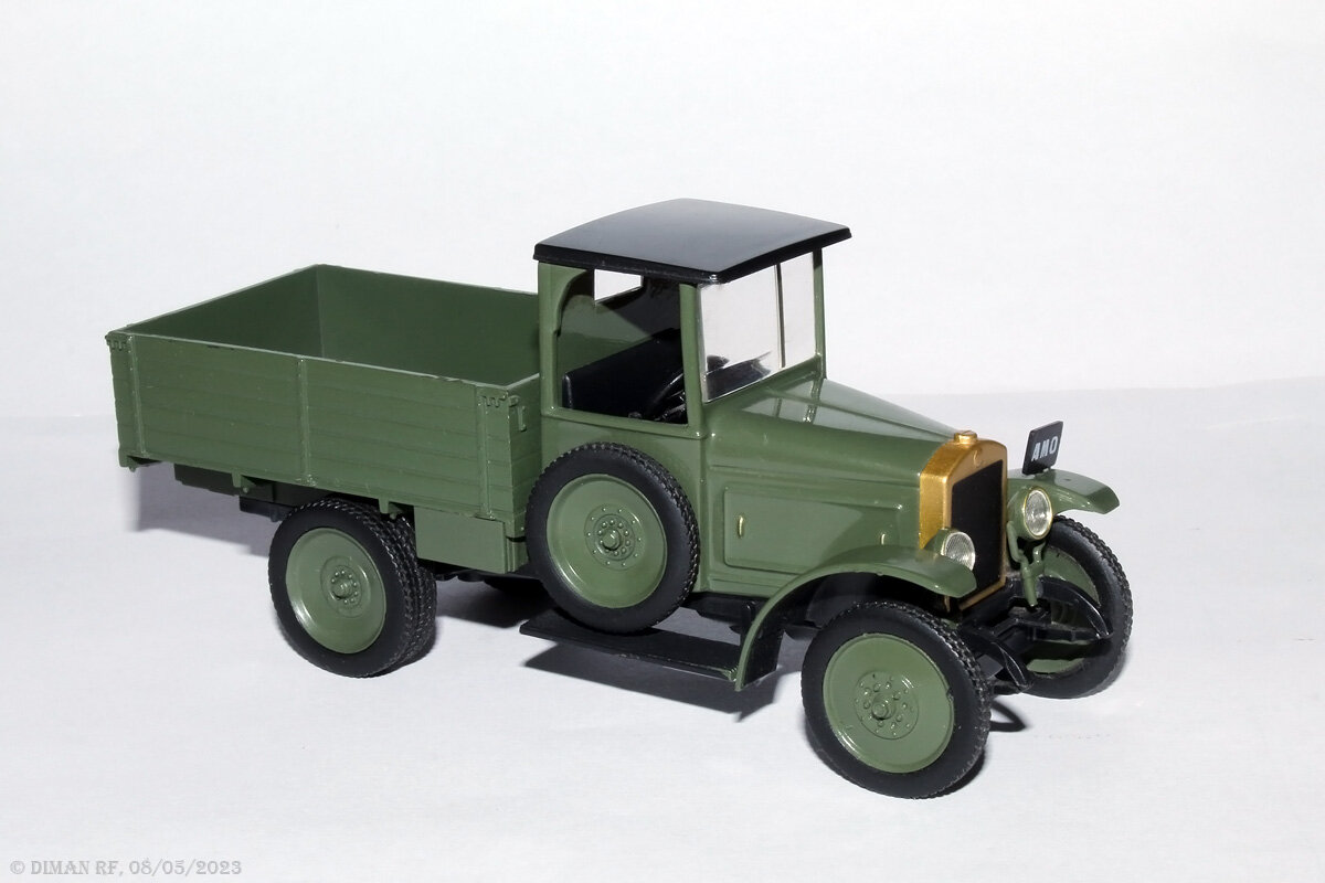 Грузовой автомобиль АМО-Ф15 являлся первым советским грузовиком, разработанным на базе итальянского грузовика FIAT 15 Ter. Впервые модель АМО-Ф15 вышла в 2012 году в журнальной серии «Автолегенды СССР» под № 87, а модель из моей коллекции относится к перевыпуску модели в серии «Автолегенды СССР. Лучшее» № 12 двумя годами позже. Так как автомобиль нельзя назвать примелькавшимся, то и к его облику придираться сложно. В модели передан образ грузовика позднего выпуска (когда складную брезентовую крышу сменила жёсткая, изменилась бортовая платформа и радиатор) из музея АМО «ЗиЛ» со всеми неточностями, присущими этому восстановленному автомобилю. Но тот музейный автомобиль выкрашен в красный цвет, а в модели попытались изобразить более классический цвет этих грузовиков Вместо эмблемы на радиаторе изображён пустой кружок. На левом крыле есть пластина для крепления номерного знака. Радиатор почему-то вместо острых граней в верхней части получил округлые, что повело за собой неверную форму кап