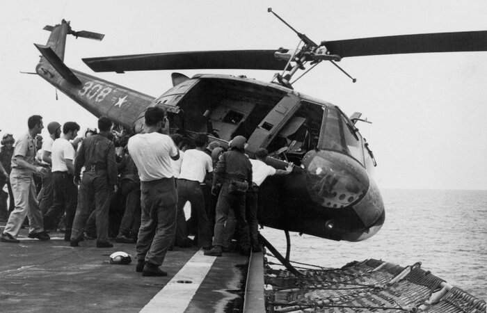 Фотография со сбрасыванием «Хьюи» с палубы авианосца была сделана в самом конце войны во Вьетнаме в 1975 году. К этому моменту непосредственно армия США участия в боевых действиях не принимала. Войска и партизаны Северного Вьетнама громили Юг. Кровавая история протяженностью в 20 лет была близка к своей развязке. Для того, чтобы лучше понять, что именно происходило в Южном Вьетнаме в те месяцы, лучше всего привести несколько аналогий. Наверняка каждый слышал о том, что в годы Второй мировой войны имел место быть коллаборационизм. После войны как в СССР, так и в других странах, например, в Польше или Франции началась охота на коллаборационистов. В первую очередь последних выискивали органы государственной безопасности и пытались придать справедливому суду.