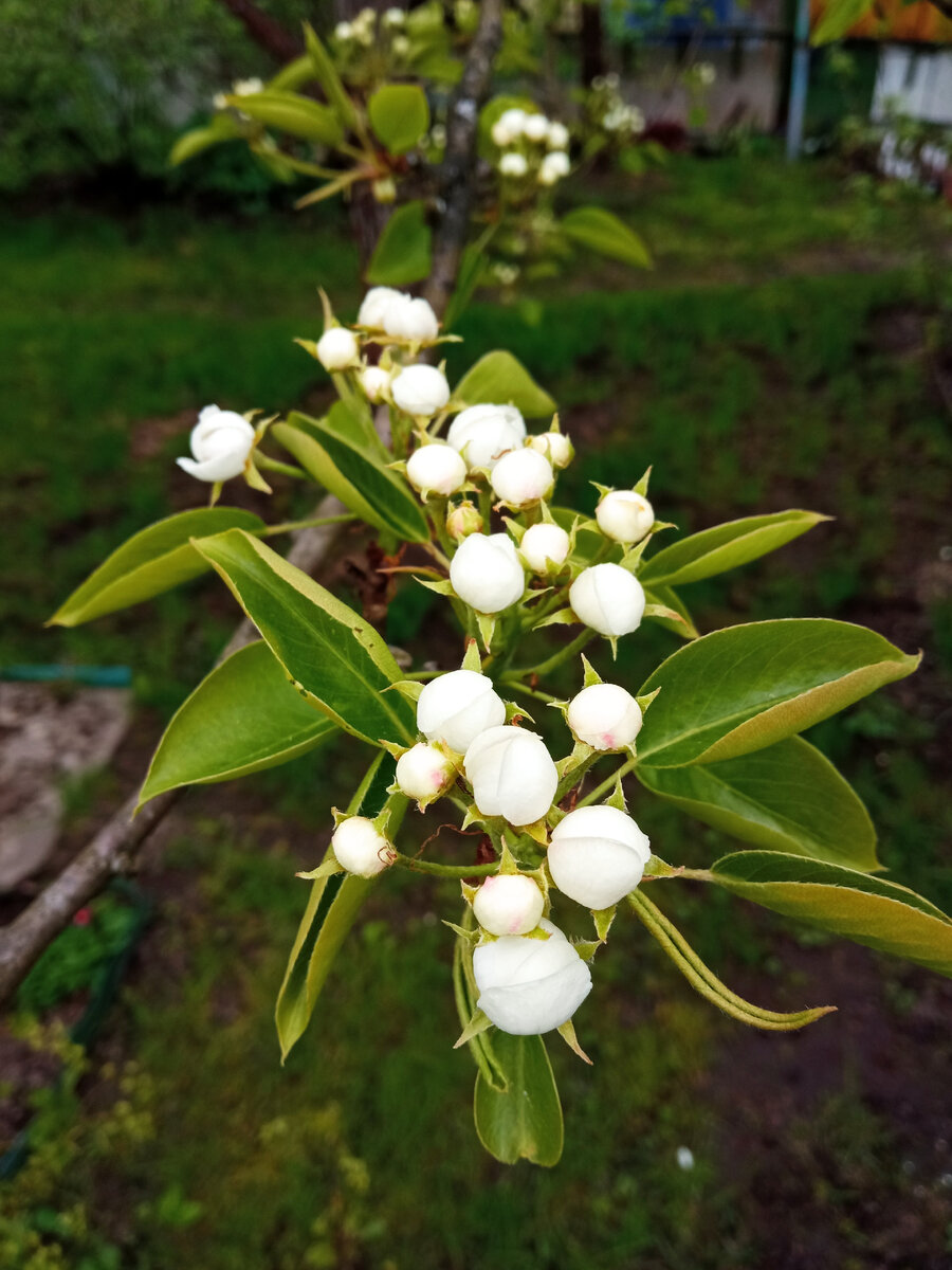 Я не была на даче несколько дней, как раз когда были самые сильные ночные заморозки. При плюс шести днём много не наработаешь. А сегодня потеплело (+10!), и я отважилась съездить посмотреть, каковы потери. За 24 года, что я занимаюсь садом, такого не видела никогда. Всем известно, что в Подмосковье заморозки могут быть и в мае, и в июне. Могут, и бывают, но таких последствий я не видела ни разу. Цветут красная и белая смородина и крыжовник. Урожая можно не ждать. Слава богу, чёрная только в бутонах, есть надежда, что всё обойдётся. Груша цветёт на верхних ветках, на нижних цветки ещё не распустились. А урожай, как правило, по большей части, бывает именно наверху. Самая моя большая боль - актинидия коломикта. Все три растения стоят с погибшими листочками. Висят, как тряпочки. Мне кажется, дело плохо. Речь уже не об урожае, а о выживании самих растений. Вторая моя боль - черешня. Вот так выглядят некоторые ветки. Цветочки просто сгорели от мороза. Листья полустеклянные. Но не вс
