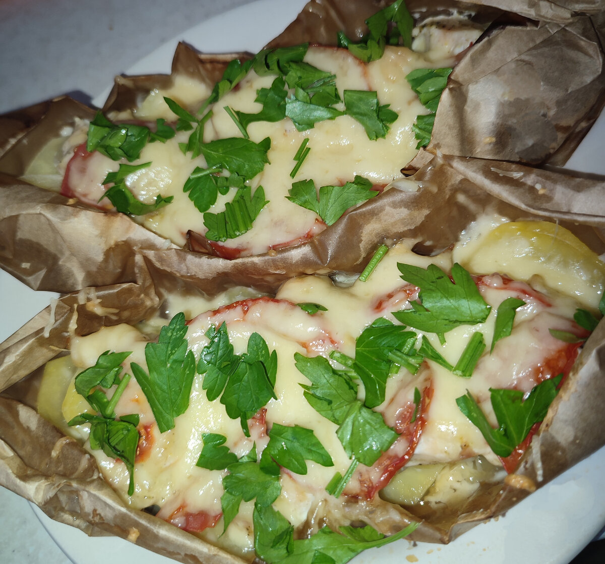 Очень вкусный рецепт порционных лодочек, которые можно подать как на ужин так и на праздничный стол. Ингредиенты: Способ приготовления: 1. Очистить и нарезать картофель тонкими кружочками. 2. Куриное филе промыть, нарезать небольшими кубиками. Переложить в глубокую тарелку, добавить пропущенный через пресс чеснок, посолить, поперчить. Можно добавить любимые специи. Перемешать. 3. Лук очистить, нарезать полукольцами. Помидор нарезать полукружочками. 4. Духовку разогреть до 180 градусов. Листы пергамента 30х30 сложить лодочками. Края листа с правой и левой стороны подогнуть примерно на 3 см по 2 раза. Концы скрутить и сформировать лодочку. Вот как должно получиться. 5. На дно лодочек выложить слой картофеля, посолить. Вторым слоем выложить лук. 6. Потом куриное филе. 7. Последний слой помидор. 8. Выложить лодочки на противень и отправить в разогретую до 180 градусов духовку на 20-25 минут. 9. Сыр натереть на тёрке, посыпать лодочки сыром и отправить опять в духовку на 15-20 минут.