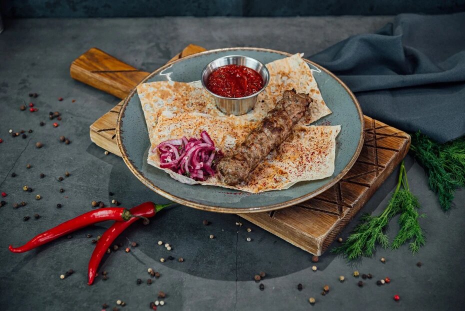 Сухая аджика 4 г 1.Говядину хорошо зачистить, убрать жилы, пленку и лишний жир. Лучше всего брать подлопаточную часть. 2.Дать мясу отдохнуть, затем отправить ненадолго в морозилку. Это нужно для того, чтобы мясо было более послушным во время лепки и не развалилось на шампуре. 3.Нарезать лук, мясо и жир кубиками. 4.Прокрутить ингредиенты в мясорубке через большую решетку. 5.Все перемешать и хорошо отбить, чтобы мясо выпустило сукровицу и лучше набивалось на шампур. 6.Поставить мясо в холодильник и дать отдохнуть в течение 2 часов. 7.Подготовить мангал и раскалить угли. 8.Смочить руки теплой водой, взять примерно 200 грамм фарша, сформировать небольшую колбаску и насадить ее на шампур. 9.Аккуратно вытянуть фарш вдоль шампура, заузив ширину с двух концов, чтобы мясо не упало в угли. 10.Переворачив