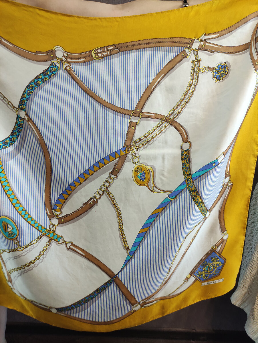 Сегодня покажу шелковые платочки, которые мне удалось найти в секонд-хенде. Самый лучший подарю победительнице розыгрыша в моем телеграм канале https://t.me/secondhandstyle – условия участия очень простые будут в конце этой статьи 🤗 "Julien Le Roy" ↓ Я очень люблю подобные классические платочные узоры с ремешками и цепями – смотрится всегда эффектно и добавляет нотку винтажного шика в образ. Солнечно-курортная цветовая палитра отлично будет смотреться в летних образах, особенно с денимом. Бренд "Julien Le Roy" занимается одеждой и часами. Красиво повязать платок на сумку – сразу появляется летняя легкость, а при надобности снять и закрыть шею от сквозняка. В