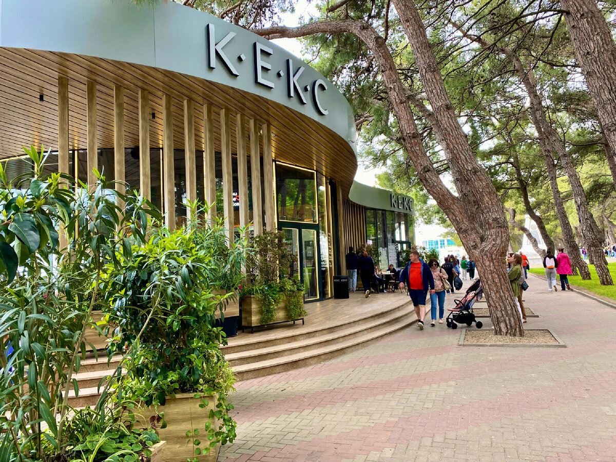 Добрый день, дорогие друзья и гости канала! Утро второго дня в Геленджике началось очень рано. На новом месте мы никогда долго не спим, поэтому уже в 9.40 утра были полностью собранные на набережной и искали место, где можно вкусно перекусить. На глаза попалось кафе "Кекс", а внимание обратили на него в первую очередь из-за того, что ранним утром почти все столы (а их здесь очень много как внутри, так и снаружи) были заняты отдыхающими, которые ждали, когда к ним подойдет официант с меню. Полная посадка чаще всего говорит о том, что цены в заведение приемлемые, а еда вкусная. Ну а иначе как объяснить тот факт, что огромное количество людей среди многочисленных уже открытых в это время кафе выбрало именно "Кекс"? В общем, мы обнаружили практически единственный небольшой стол на двоих без навеса, заняли его и начали ждать официанта. Ждали долго, минут 20, никто так и не подошел, в итоге Женя пошел искать меню сам. Цены, как выяснилось, здесь не низкие, но вполне коррелируются с место