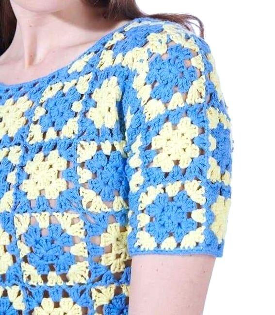 Красивый топ из квадратных мотивов крючком станет прекрасным дополнением к белым брюкам или джинсовым шортам.