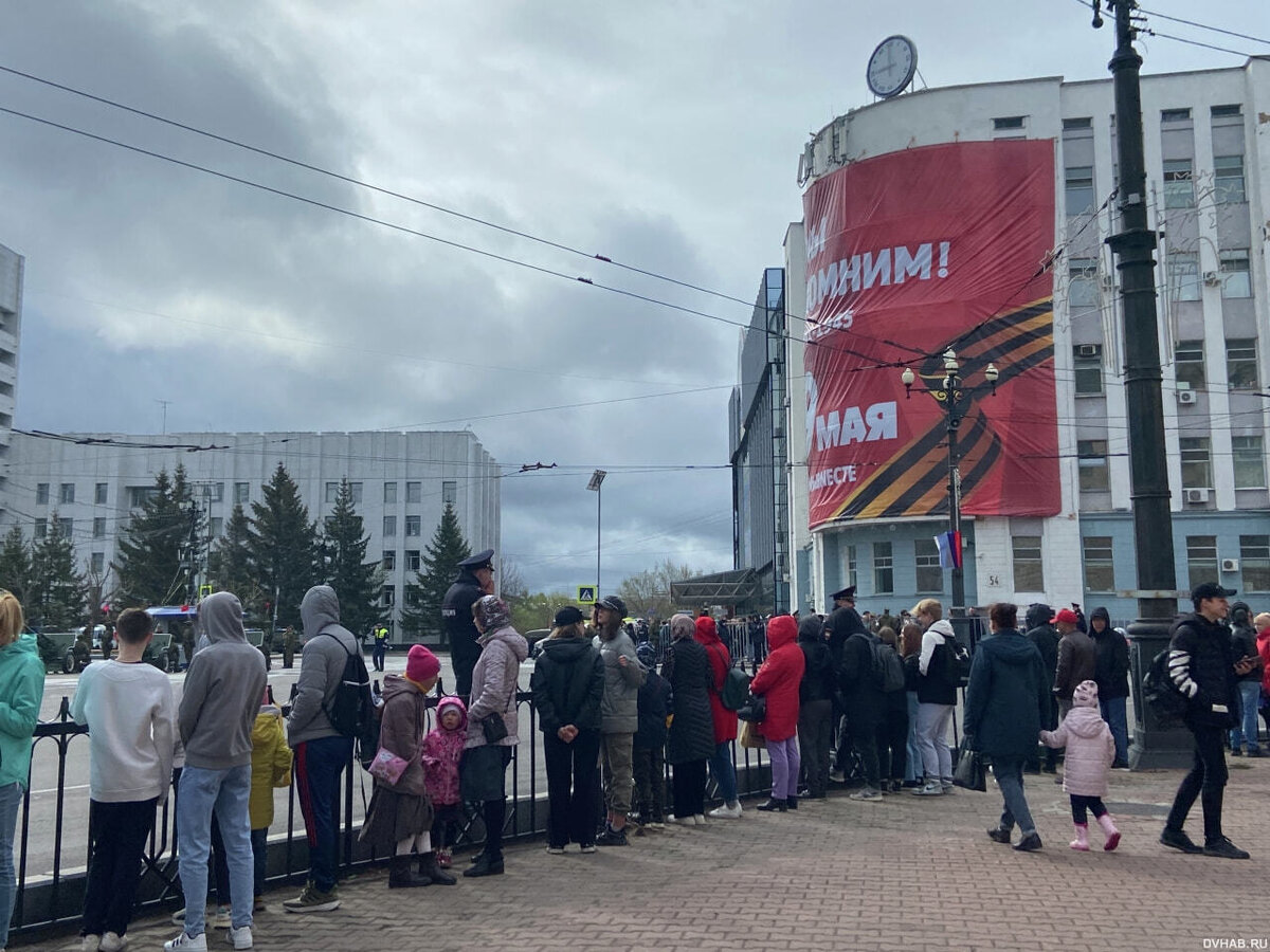 ОБНОВЛЕНИЕ 9:02 А вот и люди начали собираться. Без зрителей парад Победы состояться просто не мог. ОБНОВЛЕНИЕ 8:47 До начала парада Победы осталось немногим больше часа, военнослужащие уже построились в колонны. Корреспондент DVHAB.ru с самого утра находится в центре Хабаровска. Надо сказать, что пока ажиотаж не чувствуется. Вероятно, что погода сильно отразилась на желании людей идти в город. Многие, опасаясь дождя, решили остаться дома и смотреть парад по телевизору. Сейчас на площади имени Ленина сотрудников правоохранительных органов больше, чем зрителей. Впрочем, до парада Победы еще полтора часа, поэтому все наверняка изменится. Тем более что и общественный транспорт пока может довезти до самой площади имени Ленина, поэтому посмотреть торжественные мероприятия в Хабаровске смогут все желающие. Отметим, что 9 Мая в Хабаровске скорректируют движение общественного транспорта. Возможна даже временная приостановка движения транспортных средств по маршрутам, проходящим через центр гор