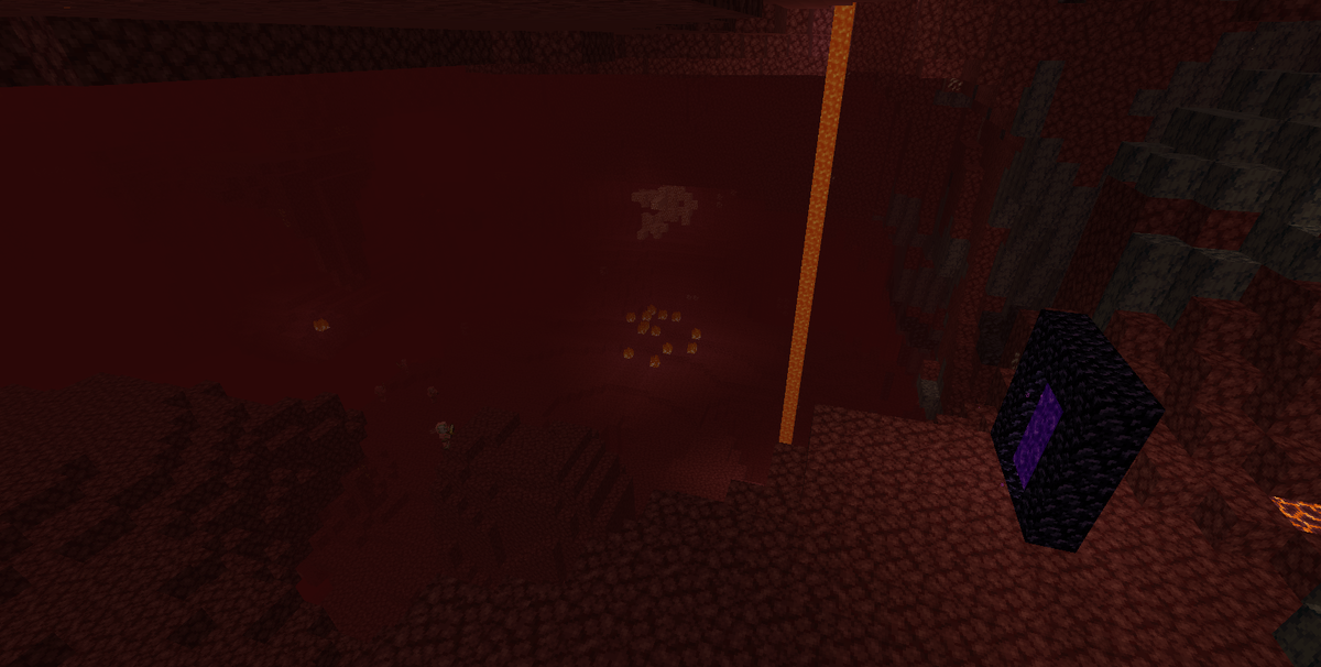 Минус — вокруг нет ни одного багрового леса. Я немного полетал, обнаружил адскую крепость и искажённый лес, а после сочинил правдивую легенду, основанную на теориях Гридлока. Изначально пиглины жили в адской крепости, окружённой багровым лесом. У них были в достатке все ресурсы. Потом багровый лес начал искажаться и заселился эндерменами, от ст