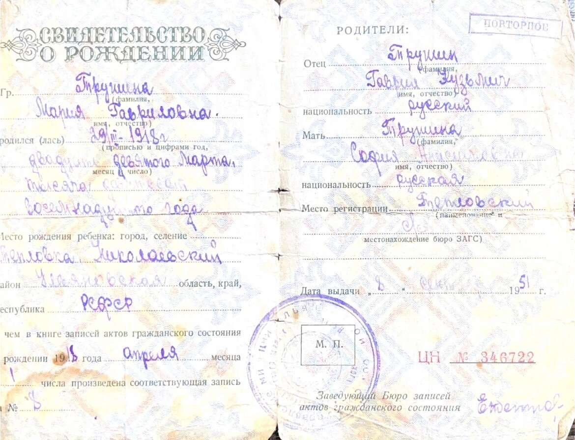 Трушина Мария Гавриловна родилась в 1918 году в селении Тепловка в Ульяновской области. Она встретила и пережила войну, работала на Ишеевской суконной фабрике, охраняя страну с тыла, и перенесла много горя и страданий. Маша с 20-ти лет работала ткачом на суконной фабрике. Девушка, будучи глухой с детства, никогда не имела инвалидности и льгот от государства, работала в тяжелых условиях труда. В военный период завод снабжал Красную Армию сукном для пошива шинелей. В то время Мария ждала ребёнка и попросила начальство перевести её в промывочный цех, так как зарплата у работников этого подразделения была больше. Став единственной женщиной в цеху, по 17 часов в сутки юная девушка в громоздких резиновых сапогах выполняла трудную физическую работу: в больших чанах мыла огромные полотна ткани, отжимала их, перетаскивала на плечах и подвешивала на специальные сооружения для сушки ткани. Тяжкий труд оказался губительным для здоровья её будущего ребёнка — родившаяся дочка Света не прожила и трёх