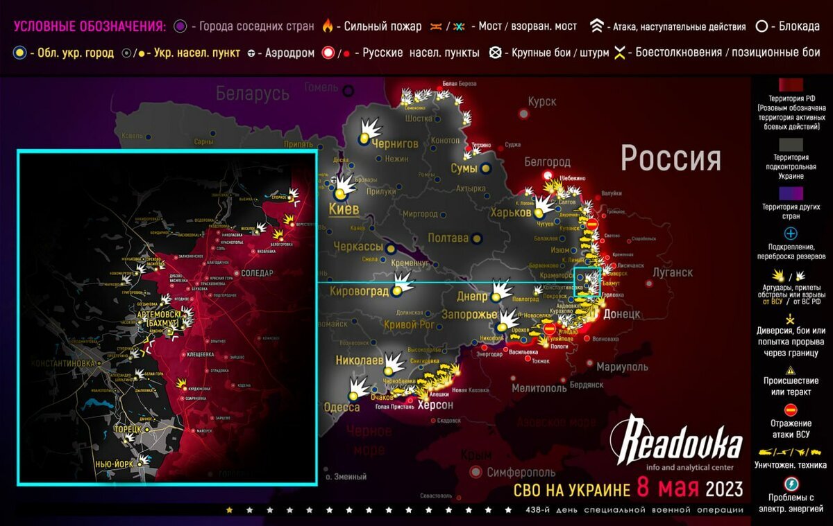 Актуальная информация за минувшие сутки. В тактике «ударов возмездия» произошли изменения. Пары из «Гераней» и X-101 поражает склады и пункты временного расположения боевиков. Связано это с тем, что уничтожение энергетической инфраструктуры не выглядит актуальным на фоне анонсированного наступления Украины. Обстановка на фронтах за уходящие сутки: Артемовское (Бахмутское) направление: за последние сутки в Артемовске ЧВК «Вагнер » продвинулись на расстояние 130 метров в западной части города. Под контролем боевиков на данный момент чуть больше 2 кв км. Также ВСУ контратаковали в районе Хромово. Продолжается штурм позиций врага в районе Красного. Донецкое направление: российская армия атаковала позиции боевиков в Нью-Йорке ДНР. В районе Красногоровки и Новобахмутовки идут бои, активно работает артиллерия. ВС РФ продолжают тяжелый штурм западной части Марьинки. Также в Минобороны РФ заявили о поражении склада с вооружением и техникой ВСУ в районе Балаклеи. Ранее Readovka публиковала карт