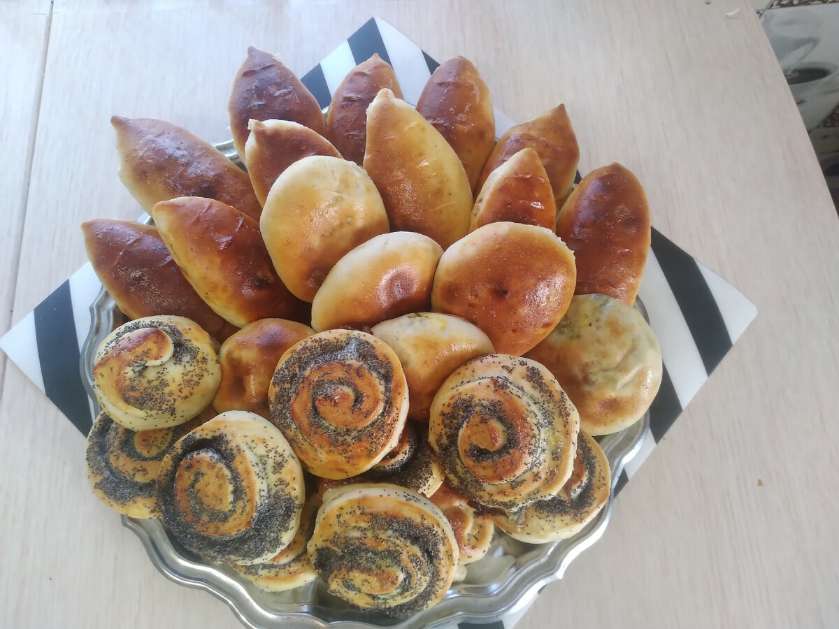 Совсем недавно стала пользоваться этим рецептом и он мне очень понравился. Делюсь с вами мои дорогие! Для теста нам понадобится: 650-700гр. муки 3 ст.л раст.масла пакетик сухих дрожжей 1 ст.л сахара 1ст.л соли 0.5 л теплой воды В теплую воду кладу соль, сахар, дрожжи и масло. Оставляю минут на 15, чтоб образовалась шапочка дрожжевая Затем добавляю муку и начинаю вымешивать тесто минут 10, делаю его таким, чтоб слегка липло к рукам, поэтому в конце замеса руки смазываю раст.маслом. Накрываю этой же тарелкой и оставляю пока не поднимется, через 40 минут было готово. За это время готовлю начинку. У меня сегодня будут пирожки с капустой, щавелем и яйцом, а из сладких напеку булочки с маком. Щавель со своего огорода Мелко режу щавель и добавляю яйца. Всё перемешиваю. Жарю капусту с луком, добавляю томатную пасту в конце жарки и зелень. И сладкие булочки с маком. Запарила мак и добавила сахар. Ну вот начинка и тесто готовы, приступаем к лепке. Выпекаю при 180 градусах 15-20 минут. Все