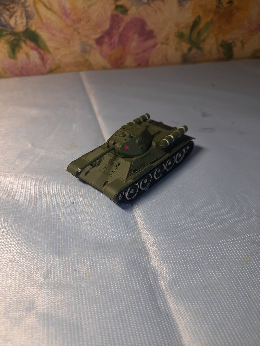 Всем здравствуйте товарищи! С вами я Макс. Поздравляю вас с праздником 9 мая! Сегодня я расскажу вам о модели танка Т 34-76. Я его собирал сам. Красиво тоже. Набор от фирмы "италлери" вроде. Танк в парадном, а не в боевом если что. Ну начнём. Спереди: Конец Пушкин окрашен в белый, а пулемет в чёрный. Сзади на башне цифра 3. Выхлопные трубы окрашены в цвет алюминий. По бокам на катках белые линии, держатели бензобаков тоже окрашены в белый. На башне звезда. Днище выше. Башня крутится на 360 градусов. Ну как вам танк? Пишите в коментах! Всех ещё раз с праздником! Пока!