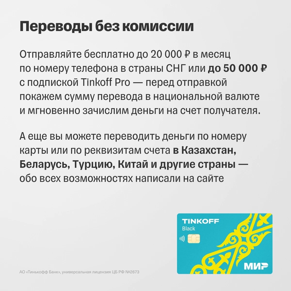 С картой Tinkoff Black легко переводить деньги родственникам в страны СНГ, снимать наличные и получать зарплату на свой банковский счет — вне зависимости от того, являетесь вы резидентом РФ или нет.