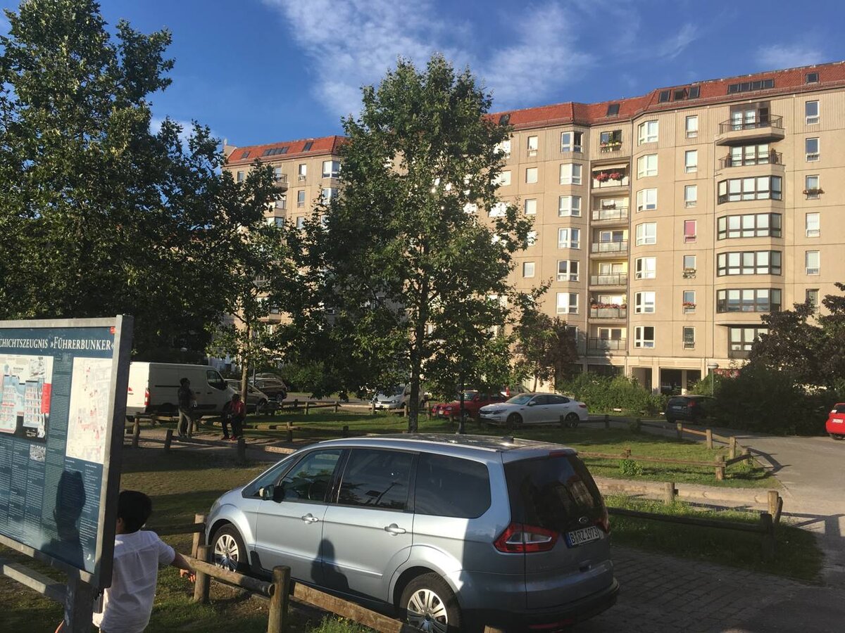 На фотографии - двор и парковка обычного панельного восточноберлинского дома по адресу Гертруд-Кольмар-Штрассе, 1-7. Именно здесь находился бункер Гитлера, именно сюда 30 апреля 1945 года солдаты вытащили и подожгли труп фюрера и его жены. На следующий день в двух кварталах отсюда, над Рейхстагом, бойцы Красной армии водрузили знамя Победы. После войны вход в бункер был взорван и засыпан. Много лет здесь был полузаброшенный пустырь вблизи Берлинской стены, а во второй половине 80-х построили этот жилой дом. Место отмечено скромным информационным щитом (слева на фото). Какая мораль во всем этом? Все, кто возраждает фашизм - заканчивают костром с бензином. Их пособникам тоже не позавидуешь. С Днём Победы, уважаемые подписчики!