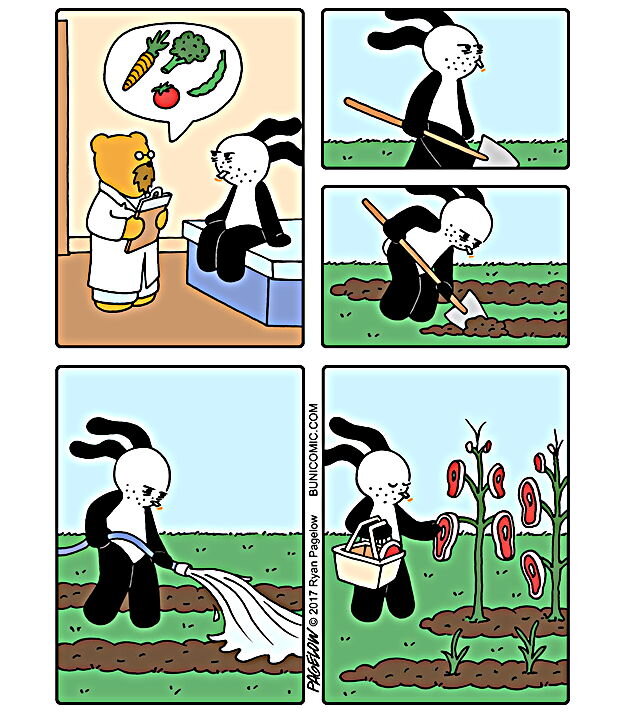 Врач советует бате - кролику вести здоровый образ жизни и есть побольше овощей. Он честно засеял грядки и собрал мясной урожай.