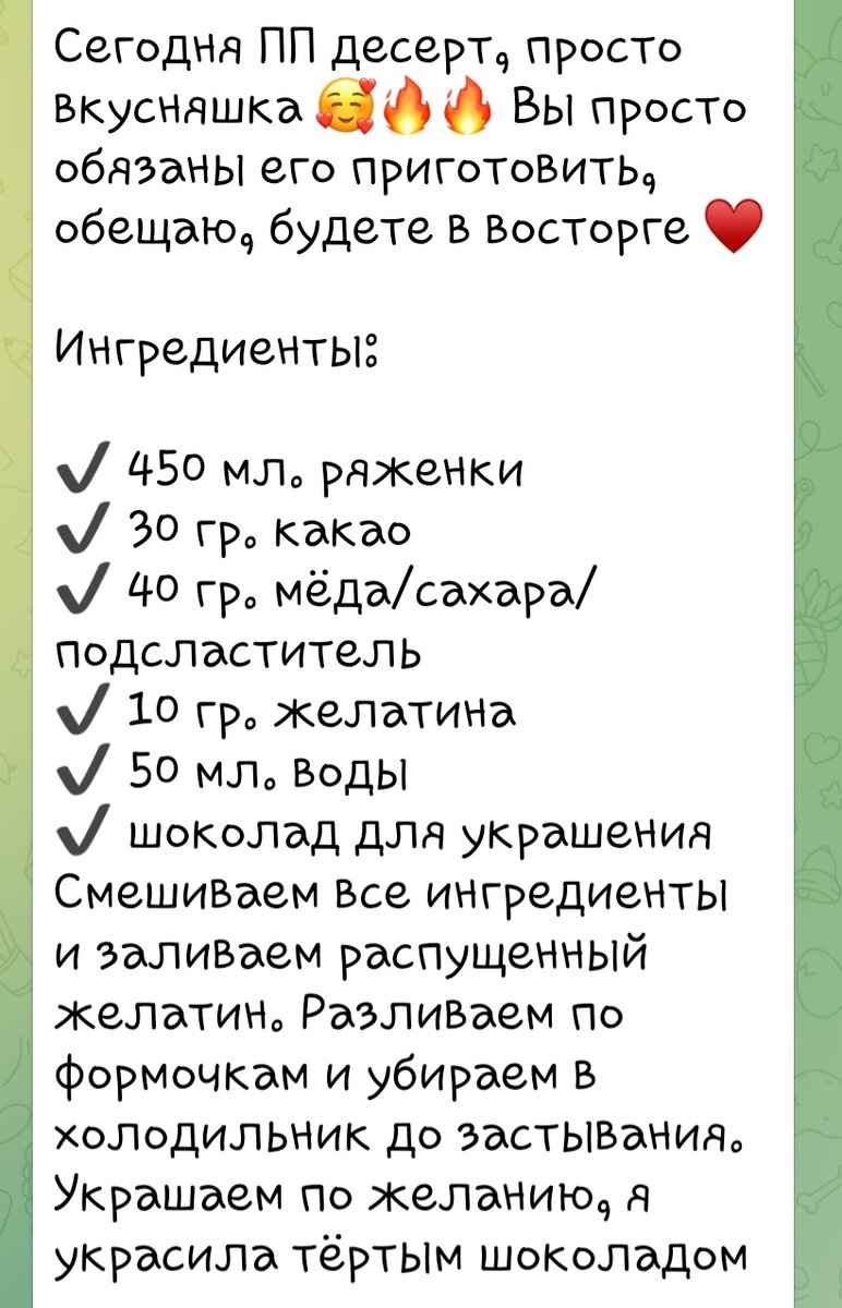 Это первое из ПП-сладостей, что я приготовила. Всегда хотелось попробовать новое, но останавливало то, что есть обычные вкусняшки: печенье, конфеты, йогурты и т.д. Максимум на что я была способна- добавить в творог фрукты. Этот рецепт с виде скриншота давно висит в моей галерее. И вот руки дошли. Купила я термостатную ряженку в стаканах. А вот о какао не подумала. Заменила на пакетик капучино. Развела желатин. Смешала все ингредиенты, разлила смесь по стаканам. Сверху посыпала шоколадом. Получилось вкусно, но с некой горчинкой от этого кофе. Консистенция густая, нежная. Вчера я сделала это же лакомство, но на жидкой ряженке 3.2 жирности из полиэтиленового пакета. На 1.5 литра ряженки добавила 2 ст.л. какао и 3 мерные ложечки стевии. Перемешала венчиком, добавляя желатин. Украсила цветной посыпкой для пасок. На этот раз консистенции ещё нежнее, воздушнее! И вкус улучшился. Соседка делает похожий десерт на сметанном продукте. Разводит желатин, смешивает со "сметаной", добавляя фрукты