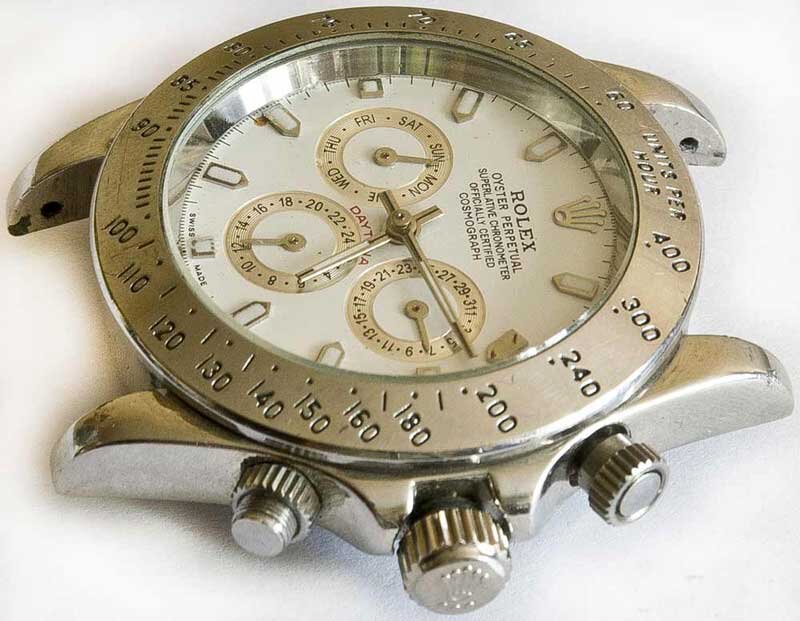 Корпус под хром или никель. Циферблат белый, на нем написано: ROLEX Oyster Perpetual Superlative Chronometer Officially Certified Cosmograpf. Потом DAYTONA и SWISS MADE. Как видим на фото, одна накладка, соответствующая цифре 2 отвалилась... Снаружи безель или люнет, который поворачивается, издавая характерные щелчки. Вращается только против часовой стрелки...