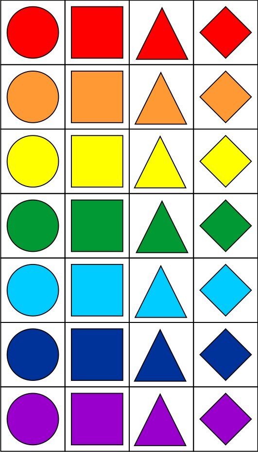Выкладывать фишки в ячейки, на пересечении нужного цвета и формы. Можно намеренно путать ячейки, чтобы ребенок смог Вас поправить. Это развивает внимание и просто весело ) Следующие три изображения нужно разрезать по черным линиям.
