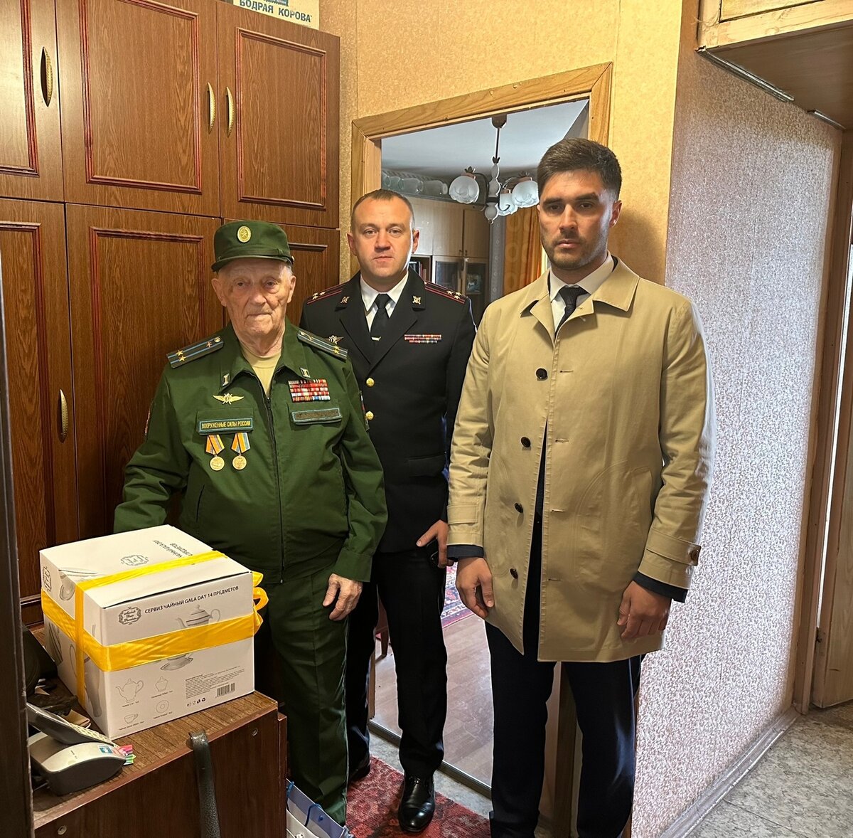 Полицейские и общественники Красногорска в канун Дня Победы навестили ветеранов и передали им подарки. Начальник красногорского УМВД РФ полковник полиции Николай Жуков вместе с председателем Общественного совета Сергеем Маликовым поздравил с праздником 96-летнего Ксенофонта Зуева и 98-летнюю Зою Кузнецову. Гости поблагодарили ветеранов за смелость и отвагу, проявленные в годы войны, и за подвиг, который навсегда останется «примером беззаветной любви к нашей родине». Жуков и Маликов передали ветеранам чайные сервизы, продуктовые наборы, пожелали крепкого здоровья, долголетия и благополучия.