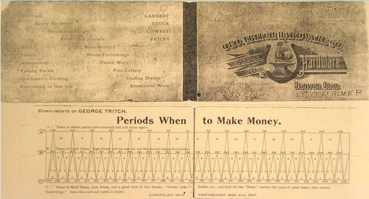Рынок — это хаос. И заработать тут можно только если повезёт. Или это неправда, и одному фермеру все же удалось найти уникальную закономерность, предсказывающую поведение фондового рынка на сотни лет вперёд? Немного истории Самюэль Беннер — металлургический фабрикант и предприниматель, он несколько раз терял свой капитал, а затем восстанавливал его. Сложнее всего оказалось в 1873 году. Тогда на фондовом рынке произошёл послевоенный обвал, который вылился в итоге в «Долгую депрессию» (1873–1879). Этот финансовый кризис стал мировым и затронул почти все сферы, а Беннер, занимавшийся производством чугуна, оказался на грани разорения и решил заняться выращиванием пшеницы в Огайо. Беннер хотел выявить закономерности в подъёмах и спадах бизнеса. Он знал, что погода и сезонные циклы влияют на урожай. Урожай диктует спрос и предложение, а из этого формируется цена. Кроме того, он стал изучать работу рыночных циклов. Беннеру удалось найти закономерности на графиках, он провёл очень глубокий и о