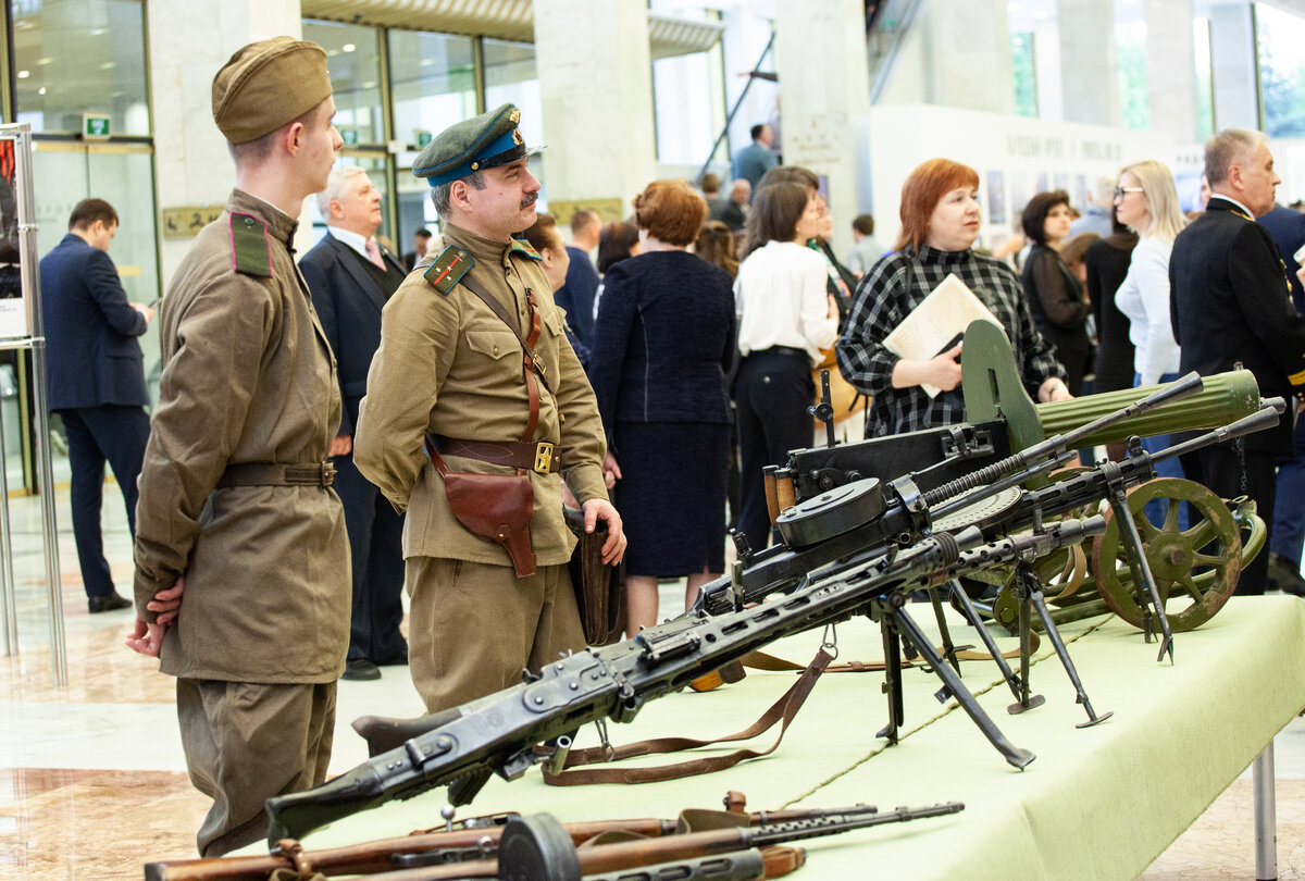 До начала программы гости вечера могли ознакомиться сразу с несколькими экспозициями, отражающими события Второй мировой войны и послевоенного периода (в числе экспонатов - работы Кукрыниксов, полотна военных художников Студии имени М.Б. Грекова, оружие и форма наших бойцов тех лет), а также с фотовыставкой, посвящённой деятельности Народного фронта в зоне специальной военной операции.