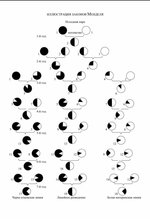 Если скрещиваются две особи с различными признаками, то возникает потомство либо похожее на одного из родителей, либо имеющее новый признак. Если продолжать спаривать потомство между собой (брата с сестрой), то получим или родительские или новые признаки. Эти закономерности, столь сложные на первый взгляд, настолько точны, что их можно выразить математически и, следовательно, предсказать результаты скрещивания. Законы наследственности открыл монах-августинец из Брно Грегор Мендель, опубликовавший их в 1865 г.; иначе их называют правилами, или законами, Менделя. Хотя эти законы наследственности открыты на гибридах гороха, они распространяются на весь растительный и животный мир.
