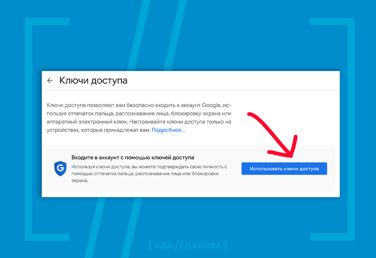 Больше новостей об IT в Telegram канале «Код Дурова» Google внедрила поддержку входа без паролей для аккаунтов и сервисов компании. Речь идёт о возможности использования ключей доступа. Они позволяют безопасно входить в аккаунт Google, используя отпечаток пальца, распознавание лица, блокировку экрана или аппаратный электронный ключ. Новый способ авторизации Passkey разработала группа технологических компаний FIDO и консорциум World Wide Web. Рассказываем, как быстро подключить вход без пароля. Функция доступна на устройствах под управлением iOS 16+, Android 9+. При входе в систему с компьютера запрос на проверку биометрии отправляется на любой совместимый девайс, связанный с вашим аккаунтом. Если такового под рукой не оказалось, или он утерян, Google позволит получить доступ с помощью опции «Использовать пароль с другого устройства» и деавторизовать ключи со всех аппаратов. Если у вас Android-устройство, то при входе в аккаунт ключи доступа генерируются автоматически. Достаточно лишь а