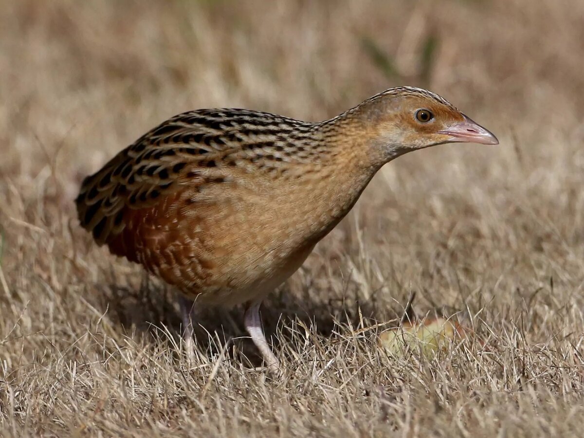Коростель Казалось бы, что птицы были созданы для того, чтобы летать. Но природа выбрала некоторые виды и лишила их не возможности полета, а желания махать крыльями. Коростелю куда комфортнее на земле: бегать в траве и собирать корм. Даже большие расстояние он преодолеет лучше пешим ходом. На то у него такие сильные лапки. По своим размерам коростель небольше цыпленка, максимальный вес особи достигает 155-160 грамм. Со стороны корпус дергача кажется несколько сплюснутым, хвост у птицы довольно длинный, клюв маленький и широкий у основания, длина крыла не превышает 16 см. Цвет оперения верхней части птицы довольно пестрый, больше преобладает рыже-бурый окрас. Брюшко и бока коростели – охристые, украшенные характерными рыжими полосами. Зоб, шея и грудина дергача – серые. Радужка – приятного орехового оттенка. Старорусское название коростели – дергач, было дано птице за счет характерных, отрывистых и напоминающих дергание звуков, издаваемых птицей. Крики коростели на открытой местности сл