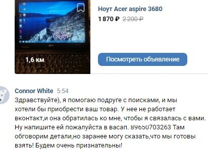 Разместил объявление на Юле. Продавал восстановленный ноутбук, цена была очень демократичная. Пишет человек
