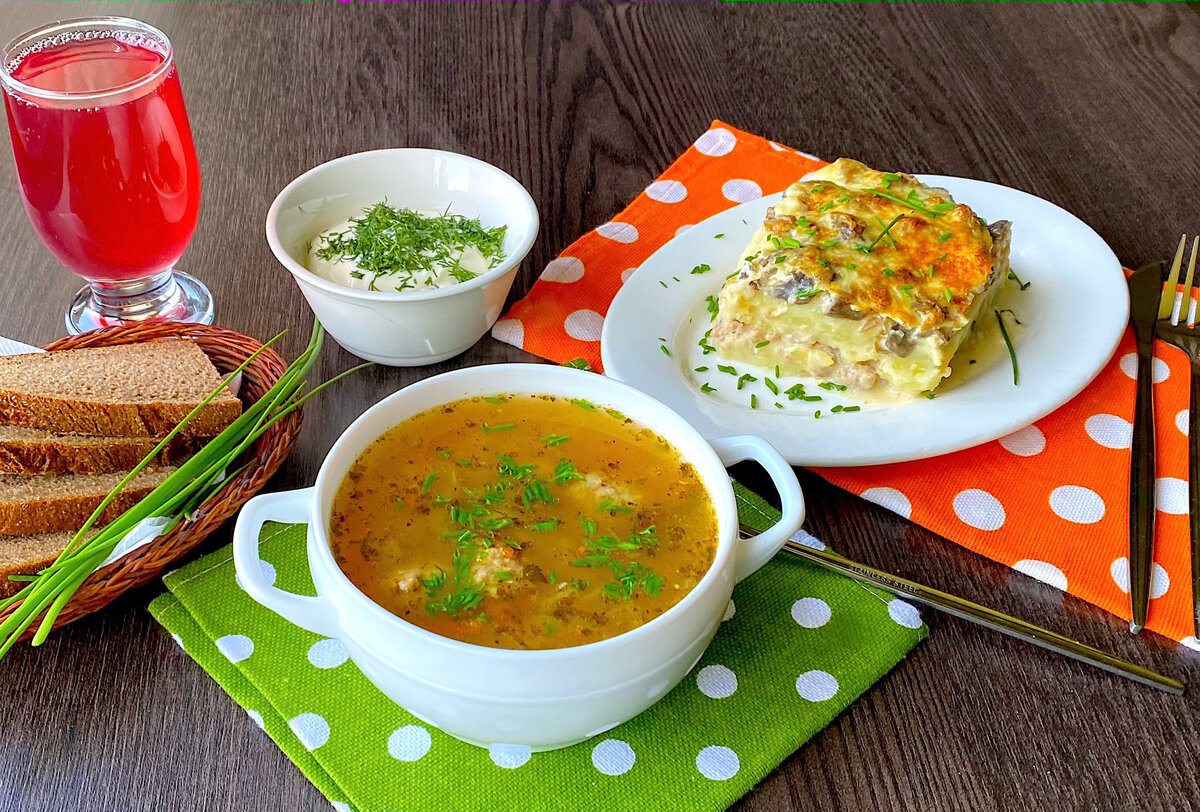 Здравствуйте, дорогие читатели! Сегодня у меня полноценное меню 🤗. Из ваших комментариев поняла, что не все едят первое и второе в обед. Да, мы тоже не всегда едим все сразу, чаще в обед едим суп, а на ужин второе. Это если выходной день. В рабочие дни получается на ужин съесть что-то одно. Но в любом случае, суп у меня всегда сварен. К примеру, я могу поесть суп два раза в день, просто с детства люблю первые блюда. МЕНЮ НА СЕГОДНЯ: Щи с фрикадельками и грибами СОСТАВ НА 3 ЛИТРА: Квашеная капуста - 350-400 г Грибы лесные - 300 г Фарш мясной - 300 г Перловая крупа - 3 ст.л. Лук - 1 шт. Специи, соль и перец - по вкусу Зелень - по вкусу Масло для жарки В идеале дать настояться щам, тогда огни будут еще вкуснее. пошаговый рецепт тут 👉 ЩИ Картофельная запеканка с фаршем и грибами СОСТАВ: Картофель - 1 кг Фарш - 300-400 г Грибы вареные лесные - 300 г Лук - 1-2 шт. Соль и перец - по вкусу Масло для жарки ЗАЛИВКА: Сметана - 3 ст.л. Яйца - 2 ст.л. Молоко - 100 мл. Соль и перец - по вкусу Тер
