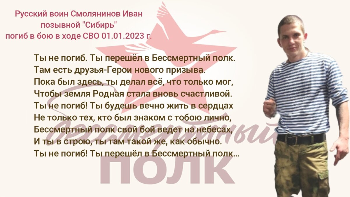Русский воин Смолянинов Иван позывной "Сибирь" погиб в бою в ходе СВО 01.01.2023 г. «Ты не погиб! Ты перешёл в Бессмертный полк»