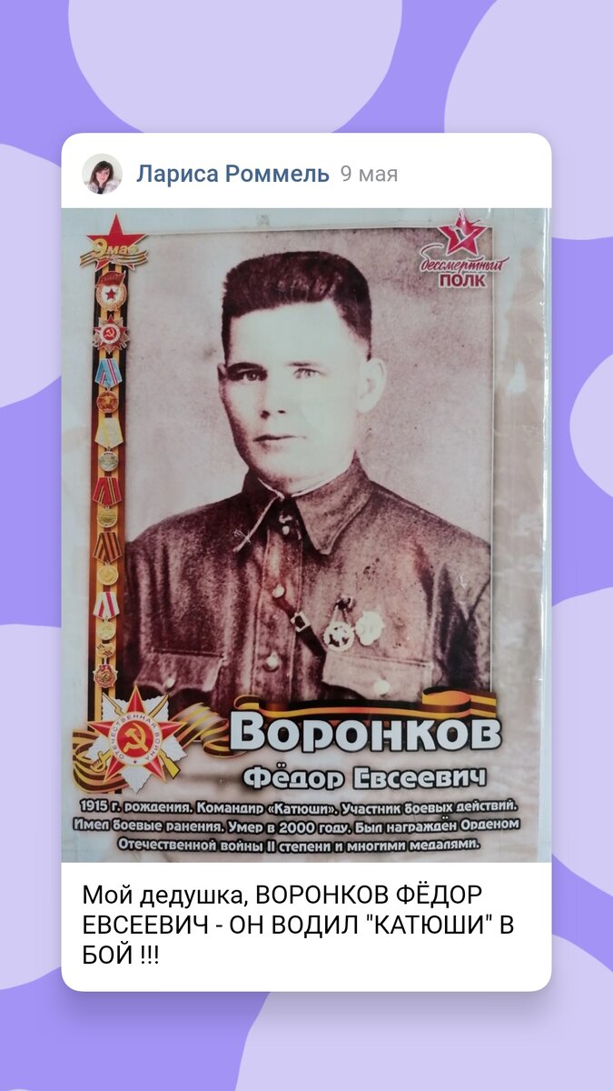 Мой дедушка, ВОРОНКОВ ФЁДОР ЕВСЕЕВИЧ - ОН ВОДИЛ "КАТЮШИ" В БОЙ !!! Артиллерию называют «богом» войны, эту обычную, ствольную артиллерию. А как же назвать «Катюши», наши гвардейские реактивные минометы? От них у фашистов душа уходила «в пятки», ракеты настигали их на земле, под землей, в блиндажах. Нет, трудно подобрать достойное название, чтобы охарактеризовать это грозное оружие ВОВ, чтобы сказать о русской «Катюше» самые точные слова. Слава гвардейских минометов «Катюши» бессмертна, незабываемые боевые подвиги тех, кто управлял ими, водил их в бой. Одним из таких войнов был мой дедушка, учитель Цветной школы Зубаревского сельсовета Оренбургского района Воронков Федор Евсеевич. Боевой путь Федора Евсеевича полон ярких событий и незабываемых эпизодов. В одном из боев за плацдармом на реке Нарев, он, командир гвардейской минометной установки «Катюши» прямой наводкой уничтожал живую силу и технику противника. Много было беспощадных смертных схваток с врагом. Воронков Федор Евсеевич был н