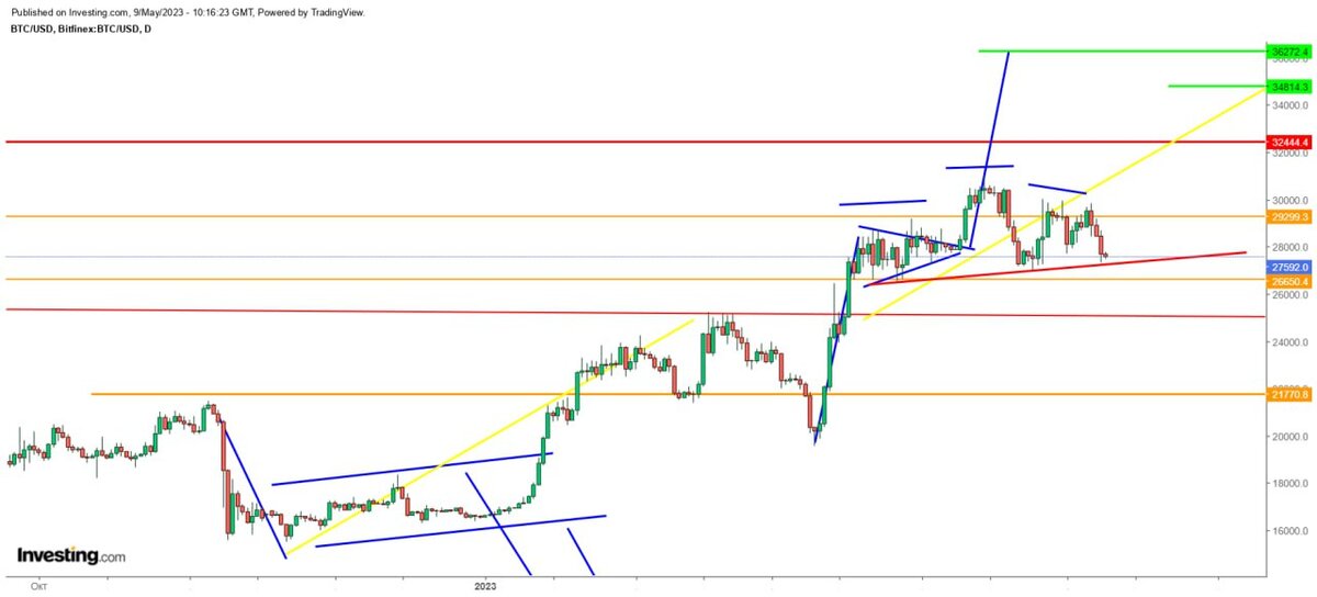 Тем не менее были высказаны мысли, что сначала цена выйдет к уровням 28,3-27,5к$ и возможно даже на прокол уровня "шеи" к 26,9-26,%к$ Вообще уровень 26,6к$ - это уровень минимума 12 мая 2022 года, который был успешно пробит ровно через месяц. Мы еще тогда говорили заранее, что если уровень будет взят, то цена отправится к диапазоне 23-19к$ с потенциалом 17к$. Все есть в истории канала