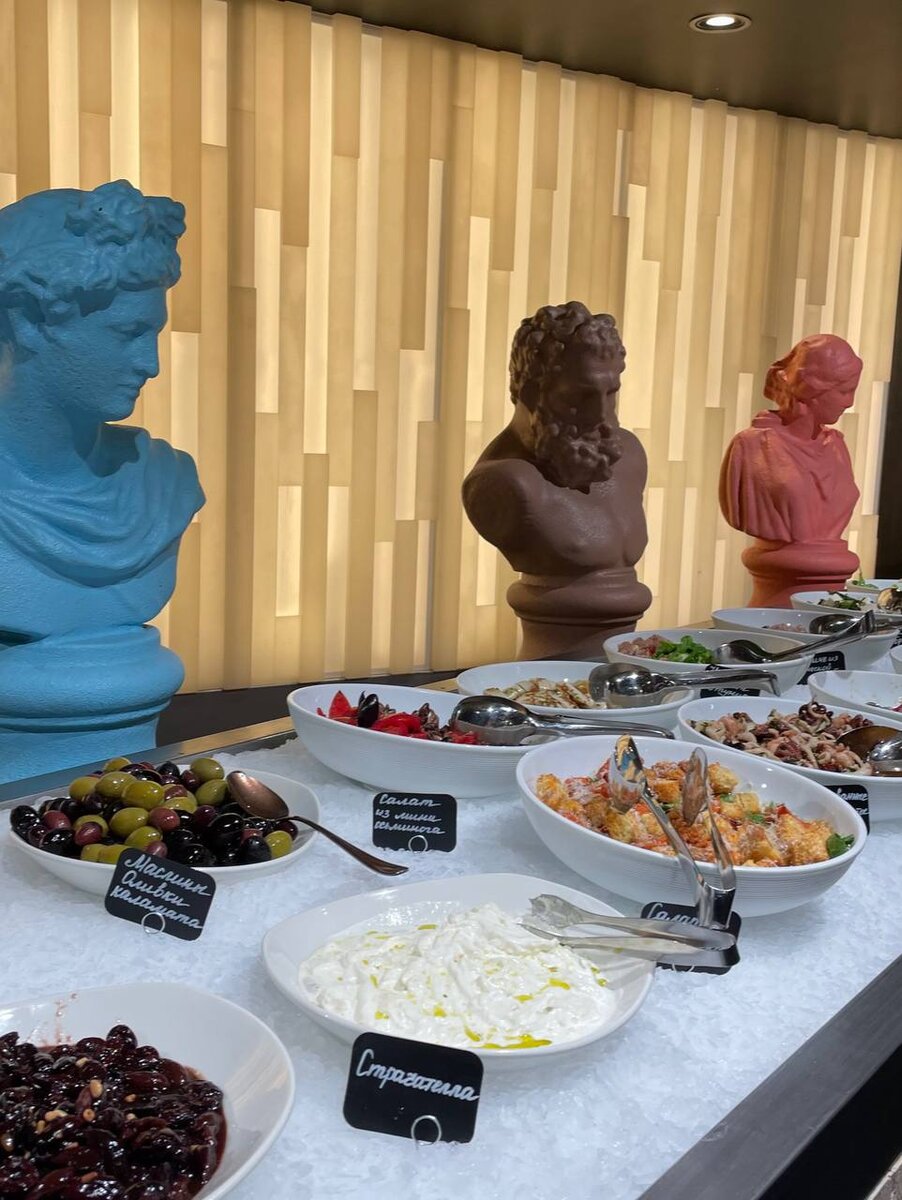Недавно сходили на Большой Греческий Бранч в Пифагор на Трубной площади. Пугающий формат шведского стола и отельные флешбеки. Да еще и не хочется за 5000₽ ходить самому с тарелкой. Такие были мысли. А на деле это оказался настоящий пир. И бранч действительно… БОЛЬШОЙ!!! Такого раздолья я не видела давно, абсолютно все безлимитно. Еда превосходного качества. Сотрудники помогают с наполнением тарелок, а потом подливают вино и воду, когда вы находитесь за столиками. Будьте аккуратны. «Горшочек не вари» тут не работает. Лучше не есть за пару суток до визита. Устрицы, горячие и холодные закуски, традиционные греческие блюда. Все не заканчивается почему-то. Я ожидала, что буду не слишком довольна тем, что оставила 5000₽, а в итоге - показалось, что тебя могут не выпустить, пока все не съешь и не выпьешь 😂 Цена полностью себя оправдывает, в ассортименте много деликатесов. Я пыталась сопротивляться, но мне вежливо намекнули, что это греческий ресторан и тут с пустыми тарелками ход