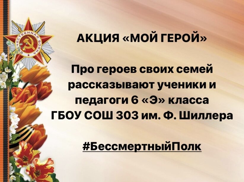 Сегодня я предложила своим ребятам рассказать друг другу про своих прабабушек и прадедушек и провести наш, классный «Бессмертный полк». Многие подошли очень ответственно. Подобрали фотографии и вместе с родными написали текст. Публикую его здесь в оригинале, так, как написали сами ребята. Рассказывает Белец Дарья: «Мой прадедушка - Чипеев Сергей Денисович, командир орудия 1675 артиллерийского миномётного полка. В 1942 году его призвали на войну, ему было 18 лет. Воевал на Южном, Закавказском, 4 Украинском и Белорусском фронтах. Дошел до Берлина. Награждён медалью "За боевые заслуги", орденом "Славы III степени", орденом "Красной звезды", орденом "Славы II степени"…» Рассказывает Иванова Диана: «Мой прадедушка воевал в Великой Отечественной войне в 1941 по 1944г. в составе 7- ой гвардейской отдельной роте разведки на должности стрелок. Был тежело ранен в 1943 г. Награждён орденом "Красной Звёзды", медалями за "Отвагу" и "За победу над Германией”…» Рассказывает Калмыков Лев: «В