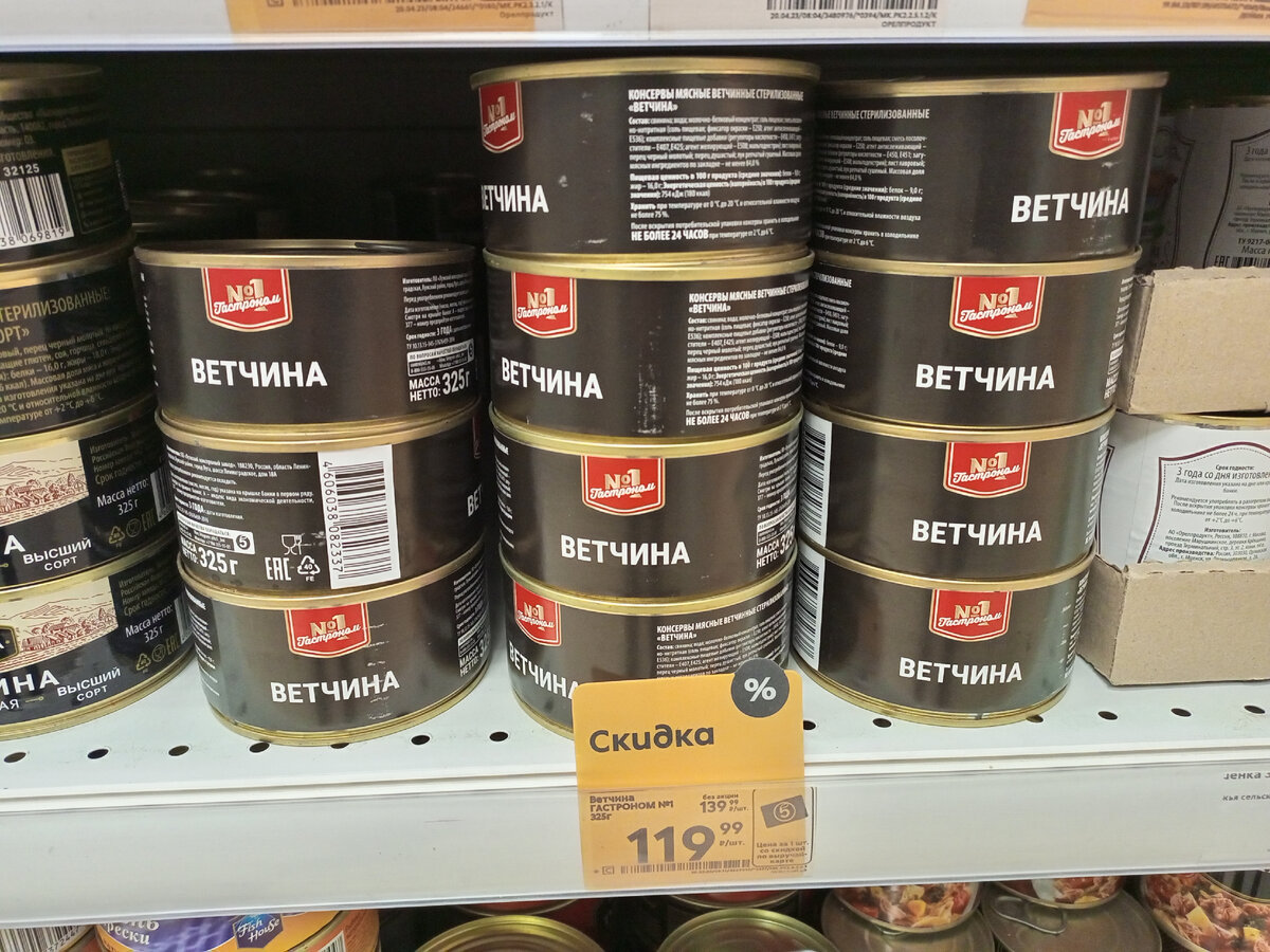 Консервы мясные ветчинные стерилизованные "Ветчина". Банка приобретена 25.04.2023 в магазине "Пятёрочка" по акционной цене за 119,99 руб. (без акции - 139,99 руб.) Масса нетто: 325 грамм. Банка снабжена ключом для отрывания без ножа. Это хорошо. Этикетка оформлена строго и лаконично, практически в чёрно-белых тонах. только эмблема производителя цветная. Срок годности: 3 года с даты изготовления. Отлично! А вот изготовлены консервы по ТУ 10.13.15-145-37676459-2016, а не по ГОСТ - это настораживает. Состав продукта довольно длинный, с массой добавок "Е": свинина, вода, молочно-белковый концентрат, соль пищевая, смесь посолочно-нитритная (соль пищевая, фиксатор окраски - Е250, агент антислеживающий - Е536), комплексные пищевые добавки (регуляторы кислотности - Е450. Е451, загустители - Е407, Е425, агент желирующий - Е508, мальтодекстрин), лист лавровый, перец черный молотый, перец душистый, лук репчатый сушеный. Не очень аппетитно, если честно... Массовая доля мясных ингредиентов по закла