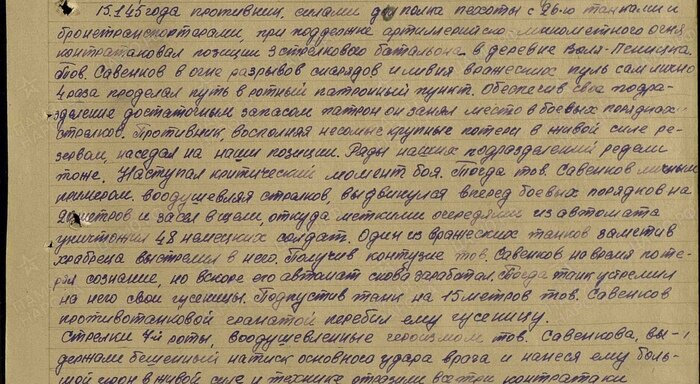 Просто почитайте. 15.1.45 Года противник, силами до (?) полка пехоты с 26-ю танками и бронетранспортерами, при поддержке артиллерийско-миномётного огня контратаковал позиции 3 стрелкового батальона в деревне Воля-Пеницка. Тов. Савенков в огне разрывов снарядов и ливня вражеских пуль сам лично 4 раза проделал путь в ротный патронный пункт. Обеспечив своё подразделение достаточным запасом патрон он занял место в боевых порядках стрелков. Противник, восполняя несомые крупные потери в живой силе резервом, наседал на наши позиции. Ряды наших подразделений редели тоже. Наступал критический момент боя. Тогда тов. Савенков личным примером воодушевляя стрелков, выдвинулся вперёд боевых порядков на 20 метров и засел в щели, откуда меткими очередями из автомата уничтожил 48 немецких солдат. Один из вражеских танков заметив храбреца выстрелил в него. Получив контузие тов. Савенков на время потерял сознание, но вскоре его автомат снова заработал. Тогда танк устремил на него свои гусеницы. Подпустив