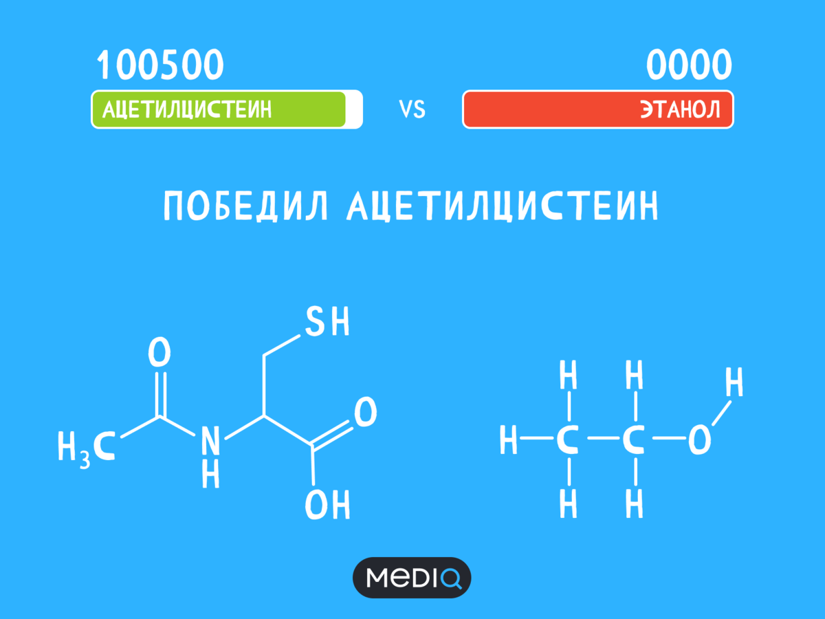 Ацетилцистеин (он же — АЦЦ или Флуимуцил) — безрецептурный белый порошок, который обычно применяют в качестве муколитического и отхаркивающего средства. Он помогает справиться с мокротой и улучшить функцию легких у астматиков, а еще хорош при отитах и синуситах. “Твою ж мать, причем здесь мое похмелье?!” — медленно начинаешь закипать ты. Но не спеши с выводами, дружище! Сейчас все объясним.