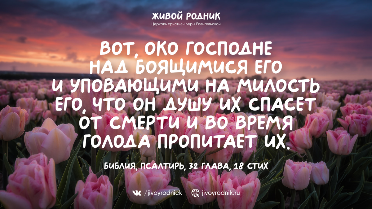 Вот, око Господне над боящимися Его и уповающими на милость Его, что Он душу их спасет от смерти и во время голода пропитает их. Библия, Псалтирь, 32 глава, 18 стих